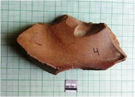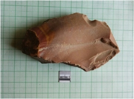 | Description / विवरण | The chert flake has surfacial flake scars and negative bulb of percussion on the surface of the flake. The piece has a cortex end and ridges due to flaking. |
