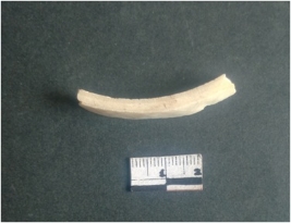 | Description / विवरण | This is a fragment of an unfinished shell circlet. It is an unfinished bangle fragment. It is white in color with polished inner surface and grounded outer surface. Rectangular in cross section. |