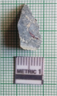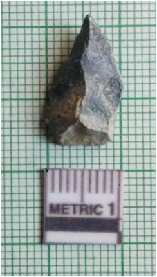 | Description / विवरण | The small schist flake has tapering sides and a median flaked ridge with a backed end. The piece is pale grey in color. |