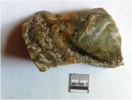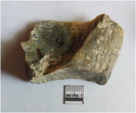 | Description / विवरण | The flake has profuse flake scars and retouched edges as a result of lithic knapping. The flake has flaked ridges and shallow bulb of percussion with flat sharp edges. |