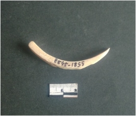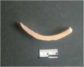 | Description / विवरण | This is a fragment of an unfinished shell circlet. It is an unfinished bangle fragment. It is white in color with polished inner surface and grounded outer surface. Rectangular in cross section. |