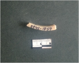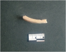 | Description / विवरण | This is a fragment of an unfinished shell circlet. It is an unfinished bangle fragment. It is white in color with polished inner surface and grounded outer surface. Rectangular in cross section. |