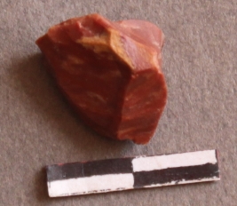 | Description / विवरण | It is a Jasper fragment. Striking platform on the proximal end and flake scars on the surface. |