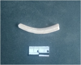 | Description / विवरण | This is a fragment of an unfinished shell circlet. It is an unfinished bangle fragment. It is white in color with polished inner surface and grounded outer surface. Rectangular in cross section. |