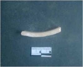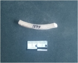 | Description / विवरण | This is a fragment of an unfinished shell circlet. It is an unfinished bangle fragment. It is white in color with polished inner surface and grounded outer surface. Rectangular in cross section. |