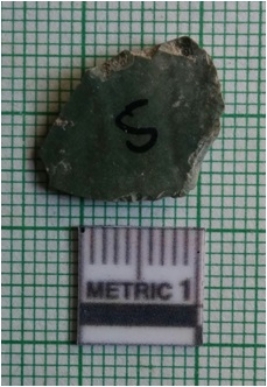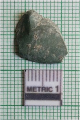 | Description / विवरण | The flat crypto - crystalline flake has flaked sides and a shallow positive bulb of percussion with sharp pointed ends. The flake has some cortex preserved on the ventral side. |
