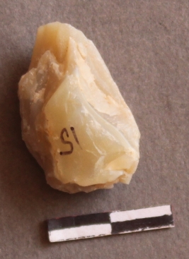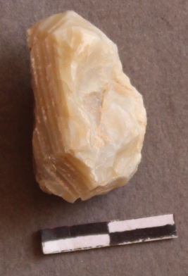 | Description / विवरण | It is a chalcedony nodule, with striking platform on the proximal end and flake ridges on the fragment. |