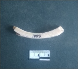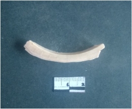 | Description / विवरण | This is a fragment of an unfinished shell circlet. It is an unfinished bangle fragment. It is white in color with polished inner surface and grounded outer surface. Rectangular in cross section. |