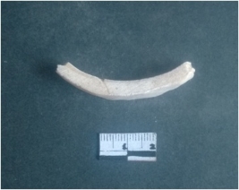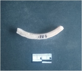 | Description / विवरण | This is a fragment of an unfinished shell circlet. It is an unfinished bangle fragment. It is white in color with polished inner surface and grounded outer surface. Rectangular in cross section. |