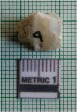 | Description / विवरण | The flat crypto - crystalline flake has flaked sides and a shallow positive bulb of percussion with sharp pointed ends. The flake has some cortex preserved on the ventral side. |