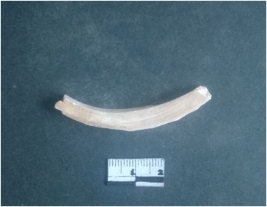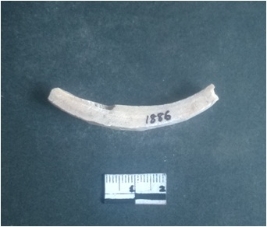 | Description / विवरण | This is a fragment of an unfinished shell circlet. It is an unfinished bangle fragment. It is white in color with polished inner surface and grounded outer surface. Rectangular in cross section. |