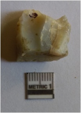 | Description / विवरण | Quadrangular flake with squarish section and cut edges due to flaking. The piece has a negative bulb of percussion and ripple marks. |