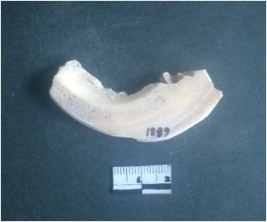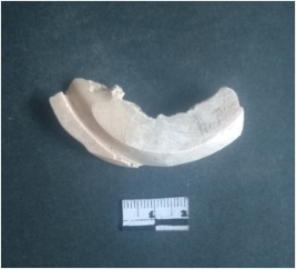 | Description / विवरण | This is a fragment of an unfinished shell circlet. It is an unfinished bangle fragment. It is white in color with polished inner surface and grounded outer surface. Rectangular in cross section. |