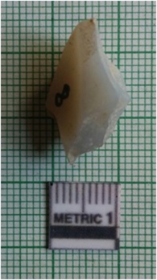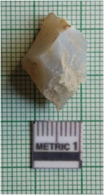 | Description / विवरण | The flat crypto - crystalline flake has flaked sides and a shallow positive bulb of percussion with sharp pointed ends. The flake has some cortex preserved on the ventral side. |