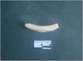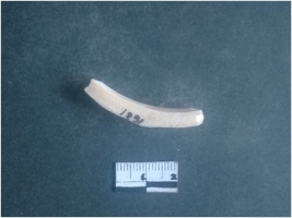 | Description / विवरण | This is a fragment of an unfinished shell circlet. It is an unfinished bangle fragment. It is white in color with polished inner surface and grounded outer surface. Rectangular in cross section. |