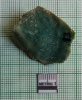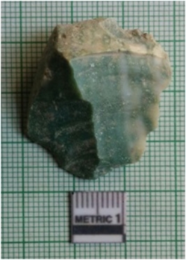 | Description / विवरण | The flat crypto - crystalline flake has flaked sides and a shallow positive bulb of percussion with sharp pointed ends. The flake has some cortex preserved on the ventral side. |