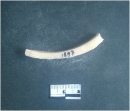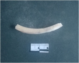 | Description / विवरण | This is a fragment of an unfinished shell circlet. It is an unfinished bangle fragment. It is white in color with polished inner surface and grounded outer surface. Rectangular in cross section. |
