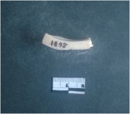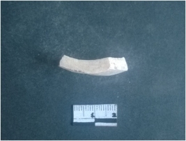| Description / विवरण | This is a fragment of an unfinished shell circlet. It is an unfinished bangle fragment. It is white in color with polished inner surface and grounded outer surface. Rectangular in cross section. |