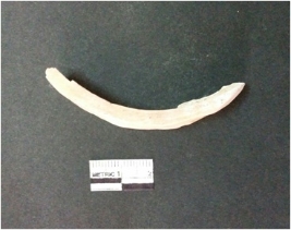 | Description / विवरण | This is a fragment of an unfinished shell circlet. It is an unfinished bangle fragment. It is white in color with polished inner surface and grounded outer surface. Rectangular in cross section. |