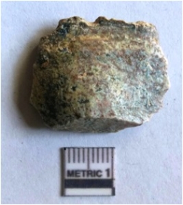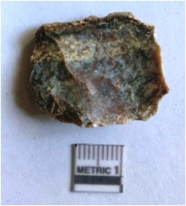 | Description / विवरण | The agate flake has a prominent bulb of percussion and roughly squarish shape with flake edges. The flake is pale grey in color, with bands as a result of natural formation. |