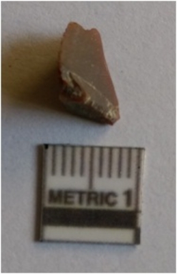 | Description / विवरण | The small flake has sharp flaked edges and tapering end. The piece has negative flake scars on dorsal surface and median ridges due to flaking is prominent. |