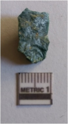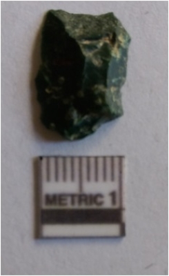 | Description / विवरण | The green jasper flake has flat section and a ridge due to flaking. The sharp edges and bulb and bulb of percussion visible on the flake. |