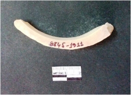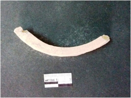 | Description / विवरण | This is a fragment of an unfinished shell circlet. It is an unfinished bangle fragment. It is white in color with polished inner surface and grounded outer surface. Rectangular in cross section. |