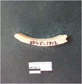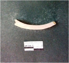 | Description / विवरण | This is a fragment of an unfinished shell circlet. It is an unfinished bangle fragment. It is white in color with polished inner surface and grounded outer surface. Rectangular in cross section. |