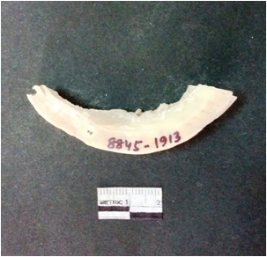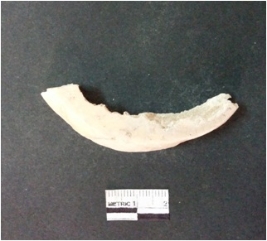 | Description / विवरण | This is a fragment of an unfinished shell circlet. It is an unfinished bangle fragment. It is white in color with polished inner surface and grounded outer surface. Rectangular in cross section. |