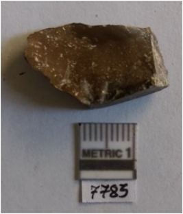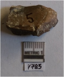 | Description / विवरण | The chert flake has sharp edges and a bulbous end with positive bulb. The flake has flaked ridges and uniform fracturing due to the crypto - crystalline. |