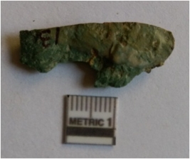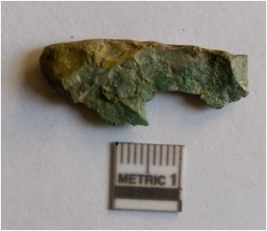 | Description / विवरण | Elongated chert piece with retouched edges and sharp pointed end due to flaking, green in color. |