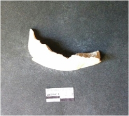 | Description / विवरण | This is a fragment of an unfinished shell circlet. It is an unfinished bangle fragment. It is white in color with polished inner surface and grounded outer surface. Rectangular in cross section. |
