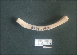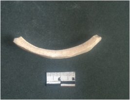 | Description / विवरण | This is a fragment of an unfinished shell circlet. It is an unfinished bangle fragment. It is white in color with polished inner surface and grounded outer surface. Rectangular in cross section. |