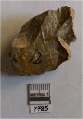 | Description / विवरण | The chert flake has sharp edges and a bulbous end with positive bulb. The flake has flaked ridges and uniform fracturing due to the crypto - crystalline. |