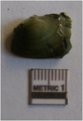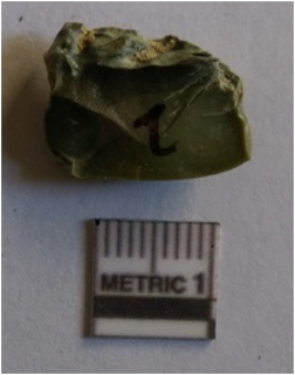 | Description / विवरण | The chert flake has characteristic flaking, with sharp edges and pointed ends. The bulbous end is clear indication of flake detachment and flat section as a result of flaking. |