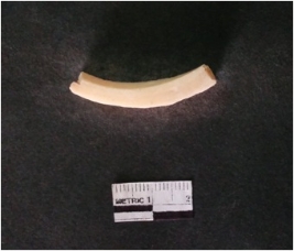 | Description / विवरण | This is a fragment of an unfinished shell circlet. It is an unfinished bangle fragment. It is white in color with polished inner surface and grounded outer surface. Rectangular in cross section. |