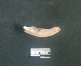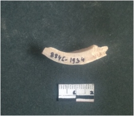 | Description / विवरण | This is a fragment of an unfinished shell circlet. It is an unfinished bangle fragment. It is white in color with polished inner surface and grounded outer surface. Rectangular in cross section. |