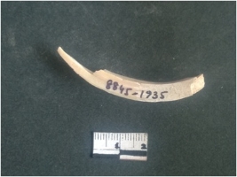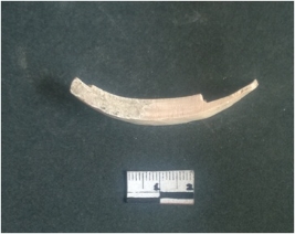 | Description / विवरण | This is a fragment of an unfinished shell circlet. It is an unfinished bangle fragment. It is white in color with polished inner surface and grounded outer surface. Rectangular in cross section. |