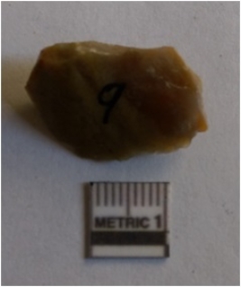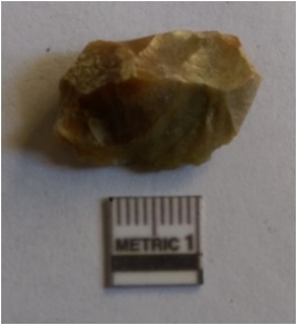 | Description / विवरण | The chert flake has characteristic flaking, with sharp edges and pointed ends. The bulbous end is clear indication of flake detachment and flat section as a result of flaking. |