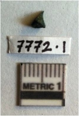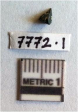 | Description / विवरण | The dark green jasper flake is squarish in shape and pointed edges. The flake has ripple marks and evidence of lithic flake detachment. |