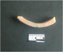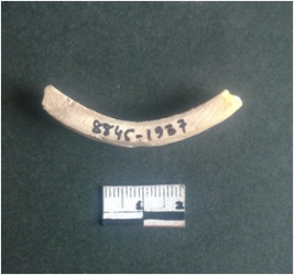 | Description / विवरण | This is a fragment of an unfinished shell circlet. It is an unfinished bangle fragment. It is white in color with polished inner surface and grounded outer surface. Rectangular in cross section. |