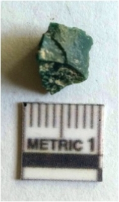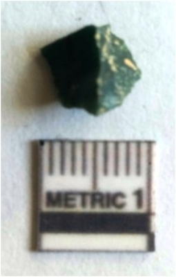 | Description / विवरण | The chert flake has pointed end and tapering edges. The flake has flaked edges and negative flake scars, with a characteristic triangular shape. Pale green in color. |