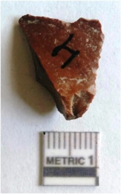 | Description / विवरण | The chert flake has pointed end and tapering edges. The flake has flaked edges and negative flake scars, with a characteristic triangular shape. Red in color. |
