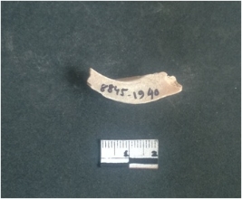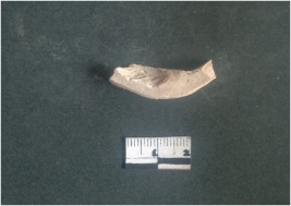| Description / विवरण | This is a fragment of an unfinished shell circlet. It is an unfinished bangle fragment. It is white in color with polished inner surface and grounded outer surface. Rectangular in cross section. |