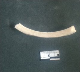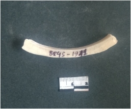 | Description / विवरण | This is a fragment of an unfinished shell circlet. It is an unfinished bangle fragment. It is white in color with polished inner surface and grounded outer surface. Rectangular in cross section. |