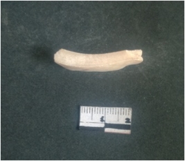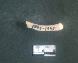| Description / विवरण | This is a fragment of an unfinished shell circlet. It is an unfinished bangle fragment. It is white in color with polished inner surface and grounded outer surface. Rectangular in cross section. |