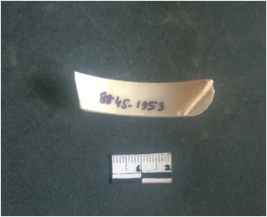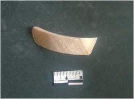 | Description / विवरण | This is a fragment of an unfinished shell circlet. It is an unfinished bangle fragment. It is white in color with polished inner surface and grounded outer surface. Rectangular in cross section. |