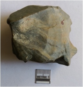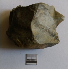 | Description / विवरण | The chert flake is flattish with evidence of secondary flaking on the surface and a prominent bulbous positive percussion bulb. |