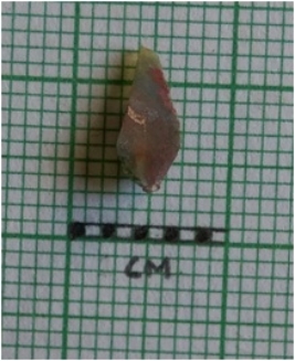| Description / विवरण | Jasper flake has sharp edges and flake scars on the surface. The piece has a flaked ridge. |