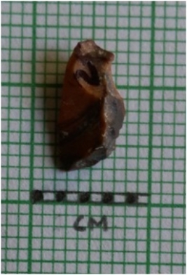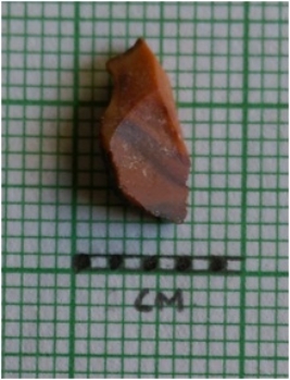 | Description / विवरण | Jasper flake has sharp edges and flake scars on the surface. The piece has a flaked ridge. |